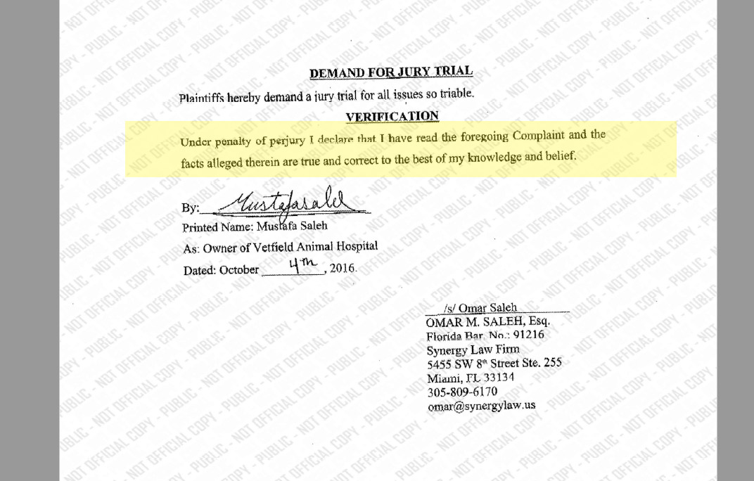 Here is Page 4 of a Verified Second Amended Complaint that Mustafa Saleh filed in Broward County on 10/10/16 in which he testifies under penalty of perjury that it is false that he would not confirm he owns Vetfield Animal Hospital.