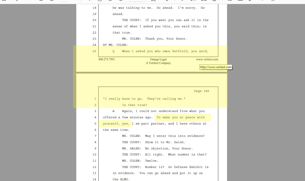 Now here is Mustafa Saleh's testimony under oath from Thursday, July 25, 2019, in Judge David Haimes's courtroom during which Saleh says it's actually true that he would not confirm he owns Vetfield Animal Hospital.