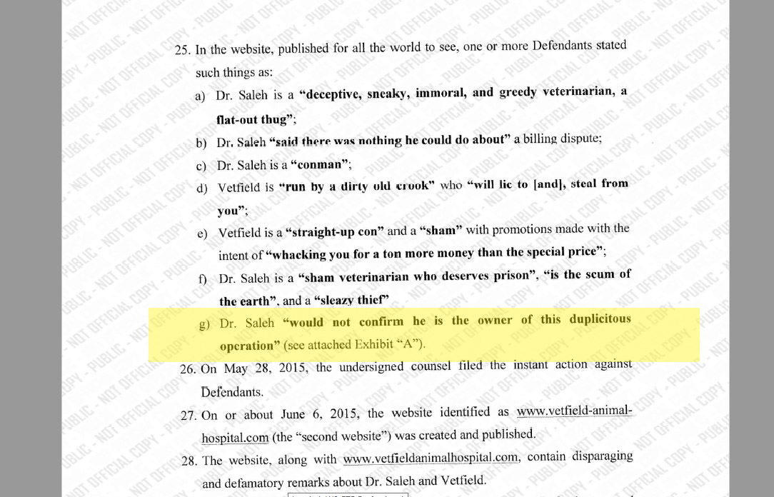 Here is Page 4 of a Verified Second Amended Complaint that Mustafa Saleh filed in Broward County on 10/10/16 in which he testifies under penalty of perjury that it is false that he would not confirm he owns Vetfield Animal Hospital.